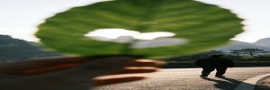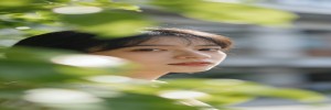 你看啊,把镜头凑近一片叶子,人站在几米外,按下快门。照片最下面是虚化的绿叶,中间是清晰的人,背景是风景。