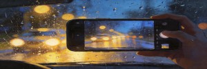 手机贴上玻璃,对焦在外面的雨滴上,背景的行人、车灯自然虚化。玻璃上的水珠像钻石,外面的世界像油画。如果玻璃是湿的,用手指抹出一块干净区域,形成“画框”效果。