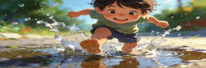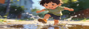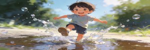 夏天孩子踩水坑,水花四溅特别快乐。普通模式拍,水花是一团白雾。