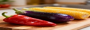 摊位上整齐排列的蔬果形成天然的色块组合:辣椒的鲜红、茄子的深紫、玉米的亮黄。