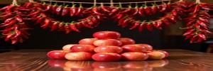 寻找规律性元素——堆成金字塔的苹果、串成帘子的辣椒、分层摆放的干货。