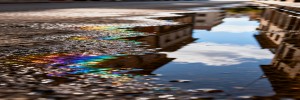 观察不同积水颜色的变化——油污水面泛着七彩光泽,干净积水映出清晰倒影。