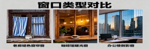 拍摄不同窗户的景象:老房子挂着褪色窗帘的窗户,咖啡馆透出温暖灯光的窗户,办公楼映出忙碌倒影的窗户。