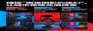 雨后的夜晚,街道积水成为天然的反光镜。蹲下放低手机,让水面倒影占据画面主体。
