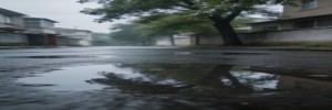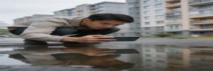 下雨天,路上到处都是水坑。大多数人绕着走,摄影师却蹲下来。